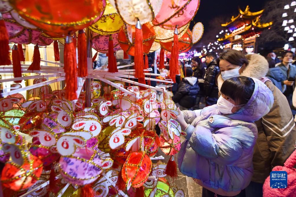 1月28日,一名小游客在南京市夫子廟景區挑選兔燈。