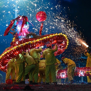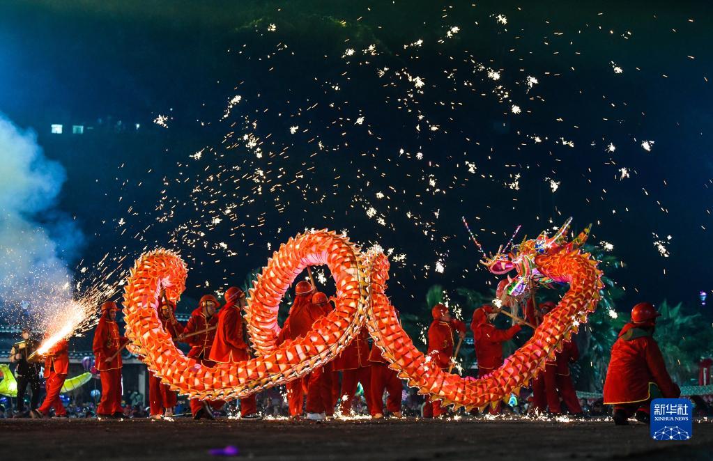 苗族“舞龍噓花”是當地人用土火藥和楠竹等制成噓花筒向舞動(dòng)的彩龍噴射所形成的絢麗景象。2021年,苗族“舞龍噓花”習俗入選國家級非物質(zhì)文化遺產(chǎn)名錄。