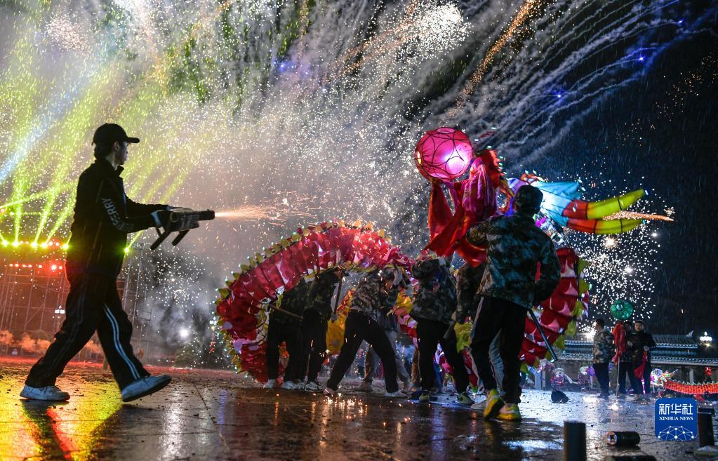 2月4日晚,人們在臺江縣參加苗族“舞龍噓花”活動(dòng)。