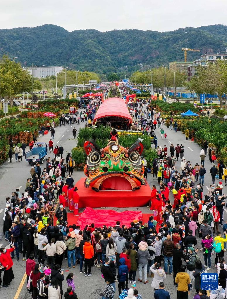1月15日,在佛山市南海區西樵鎮西樵山牌坊,人們圍觀(guān)時(shí)隔18年再次出獅巡游的“獅王”獅頭(無(wú)人機照片)。