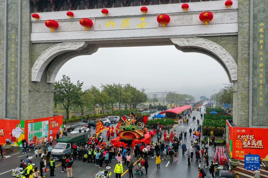 1月12日,在佛山市南海區西樵鎮西樵山牌坊,人們爭相目睹高4.68米、寬4.5米的“獅王”獅頭(無(wú)人機照片)。