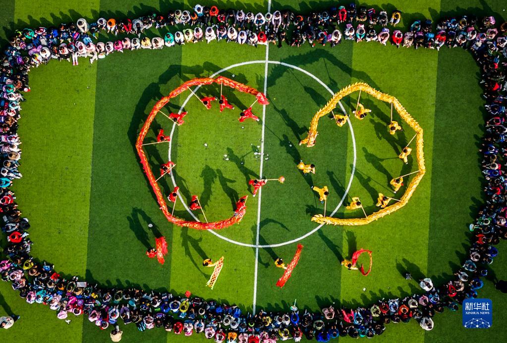 2月5日,在合肥市蚌埠路第二小學(xué),孩子們表演舞龍(無(wú)人機照片)。