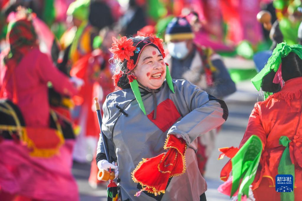 2月5日,在內蒙古赤峰市巴林左旗,社火隊員在街頭表演。