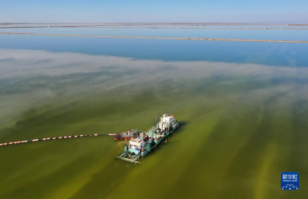 水采船在察爾汗鹽湖中作業(yè)(2月2日攝,無(wú)人機照片)。