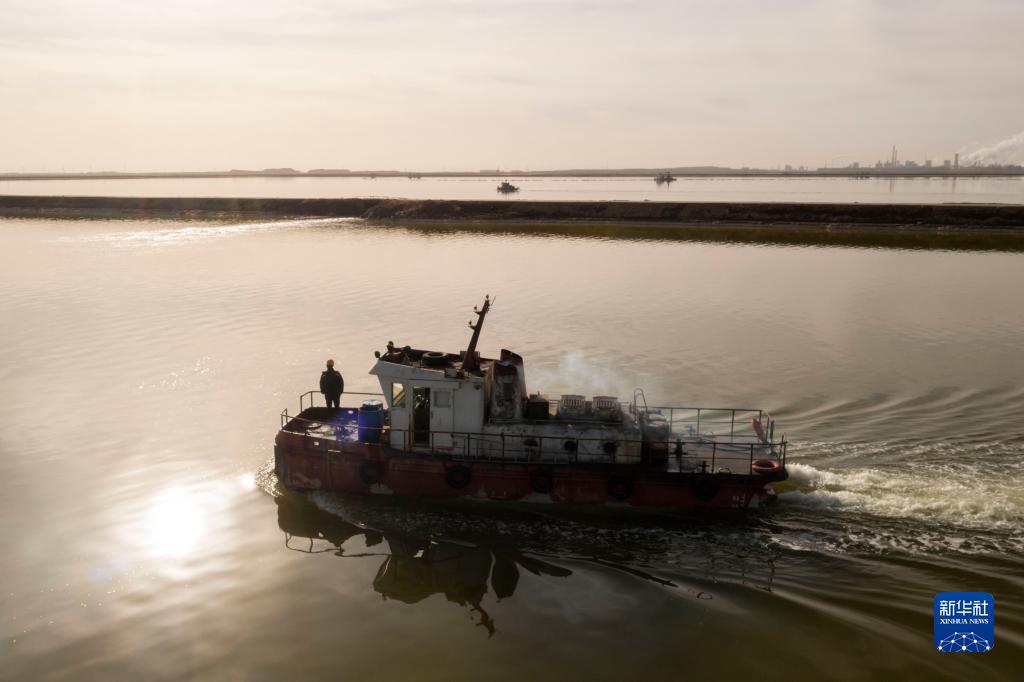 2月2日,賀連福乘坐工作船前往水采船。水采船在劇毒的鹵水鹽田中作業(yè),工作人員每天上下水采船都要通過(guò)工作船接駁。