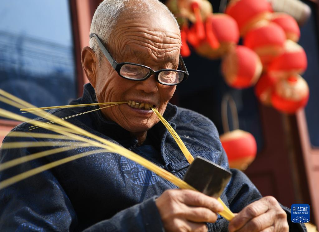 王學(xué)坤展示編織竹篾燈籠時(shí)的“破篾”技藝(2月4日攝)。