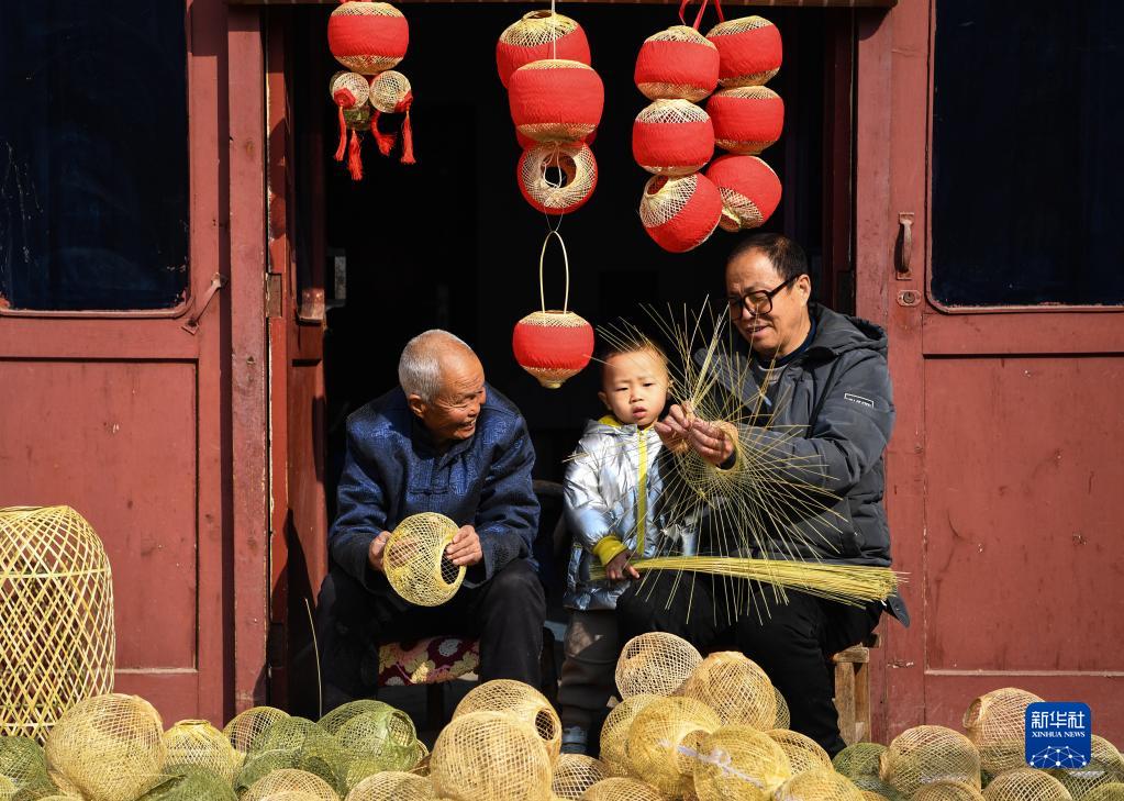 王學(xué)坤(左)編完燈籠后與家人交流(2月4日攝)。