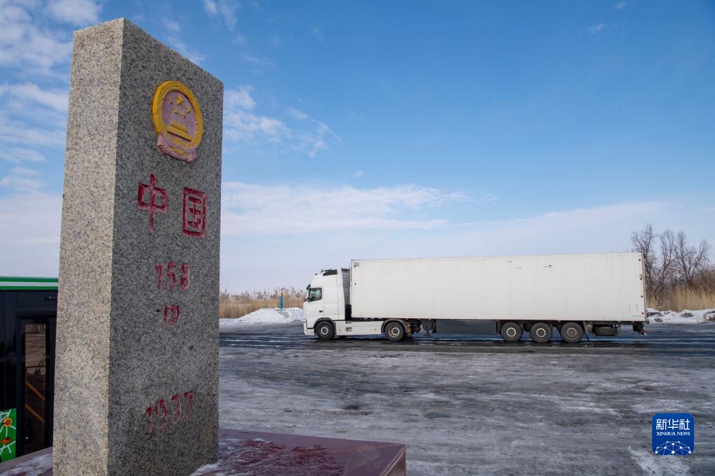 一輛滿(mǎn)載貨物的卡車(chē)駛離巴克圖口岸,開(kāi)往哈薩克斯坦(2月4日攝)。