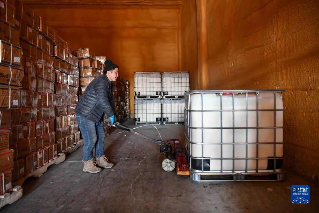 工人在新疆塔城地區一家外貿企業(yè)貨場(chǎng)搬運即將出口哈薩克斯坦的密封漆(2月4日攝)。