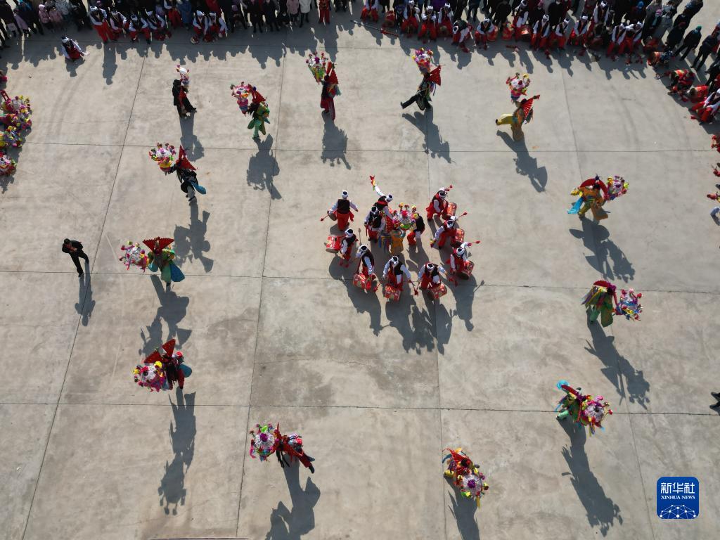 2月5日,在甘肅省永靖縣劉家峽鎮城北新村,鄉村秧歌隊在表演民俗節目“太平鼓舞”。