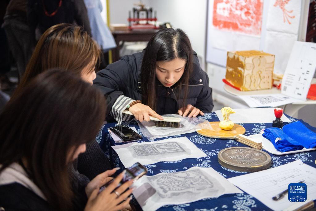 2月5日,在湖南省長(cháng)沙市天心區太平老街前行美術(shù)館,市民在體驗拓印。