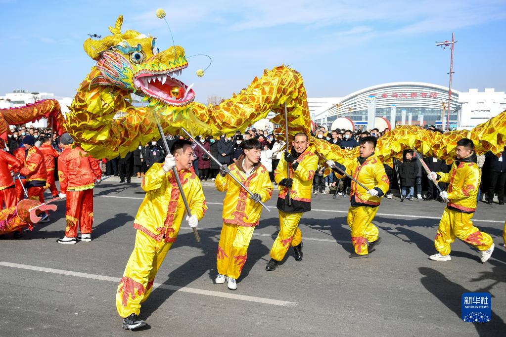 2月5日,人們在內蒙古烏蘭察布市烏蘭察布站前廣場(chǎng)表演舞龍。