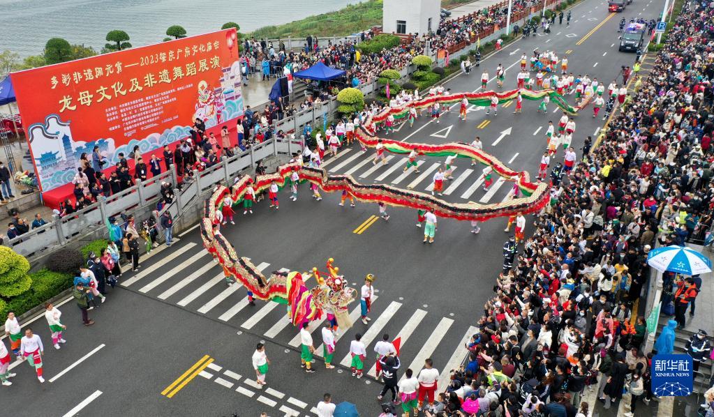 2月5日,在廣東肇慶廣府文化廟會(huì )現場(chǎng),人們在觀(guān)看舞龍表演(無(wú)人機照片)。