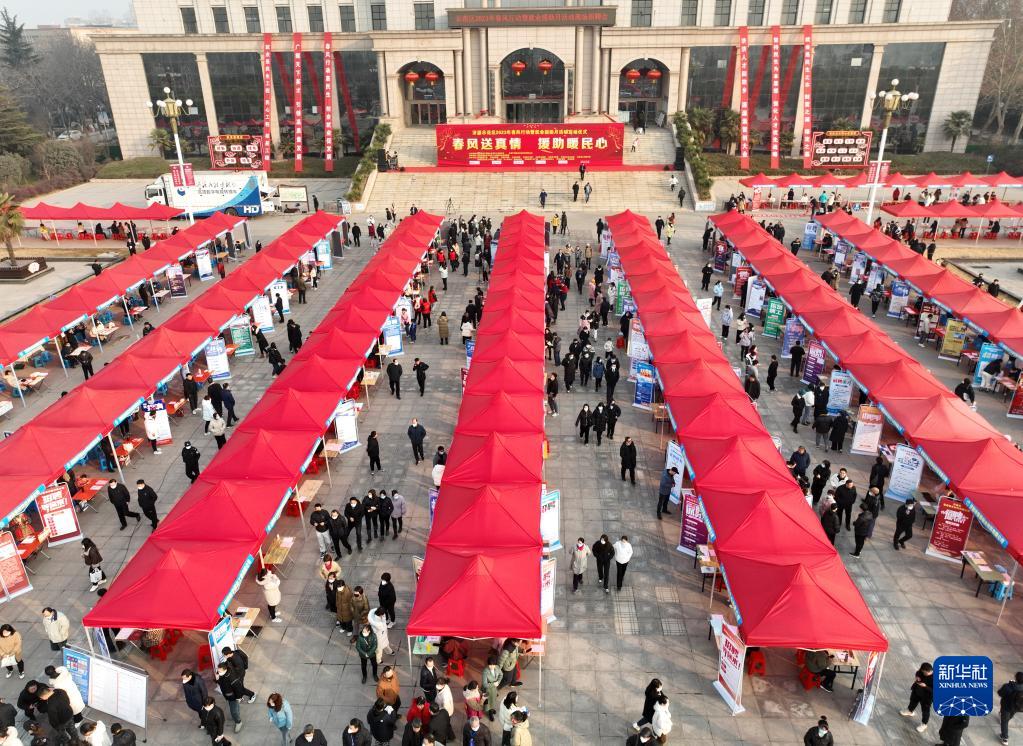 這是2月5日拍攝的河南省濟源市“春風(fēng)行動(dòng)”暨就業(yè)援助月大型招聘會(huì )現場(chǎng)(無(wú)人機照片)。