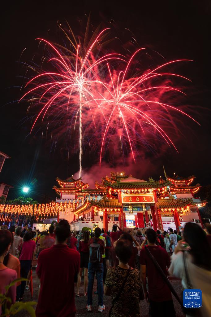 2月5日,民眾在馬來(lái)西亞吉隆坡天后宮觀(guān)賞煙花。