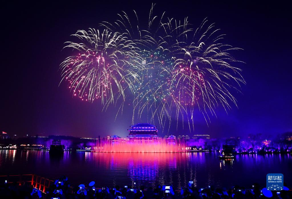 2月5日晚,2023西安曲江上元煙花晚會(huì )在大唐芙蓉園舉行。晚會(huì )上燈在水里游、人在船中舞、焰火漫天空,西安市勞模及先進(jìn)工作者、公安和消防及醫護人員等社會(huì )各界人士代表千余人和3000名市民代表相聚觀(guān)演。