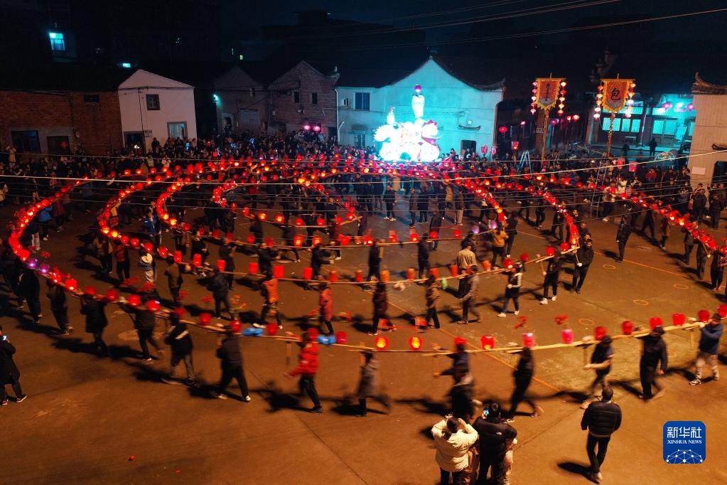 2月5日晚,浙江省東陽(yáng)市南馬鎮防軍村的村民們在迎龍燈鬧元宵(無(wú)人機照片)。