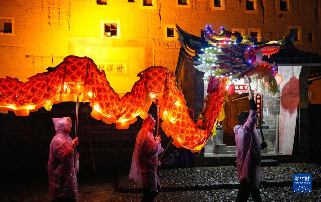 2月5日,在福建省龍巖市永定區高頭鎮高北村,村民在村莊內游龍,途經(jīng)土樓“世澤樓”。