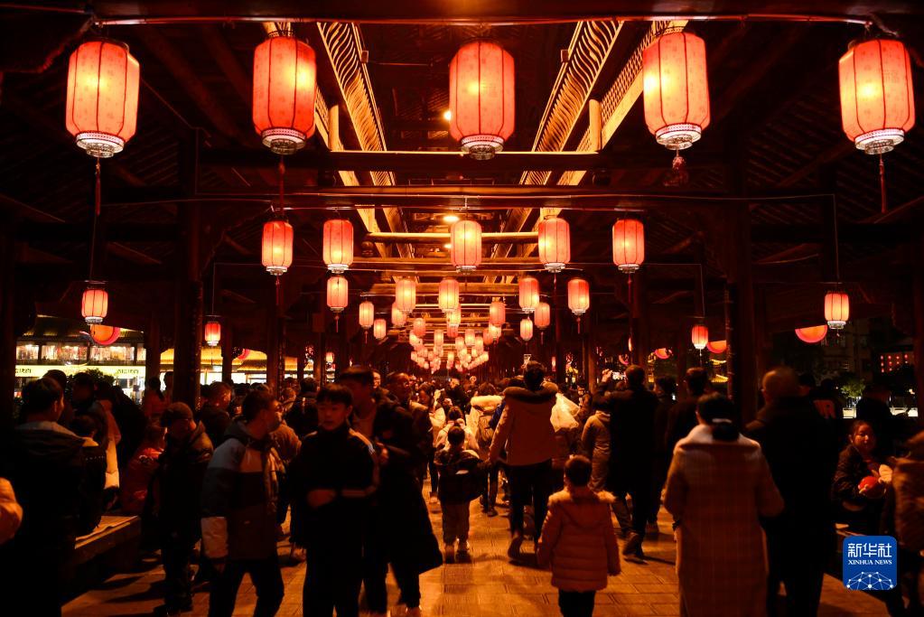 2月5日晚,湖北省宣恩縣仙山貢水旅游區的風(fēng)雨橋上人潮涌動(dòng)。