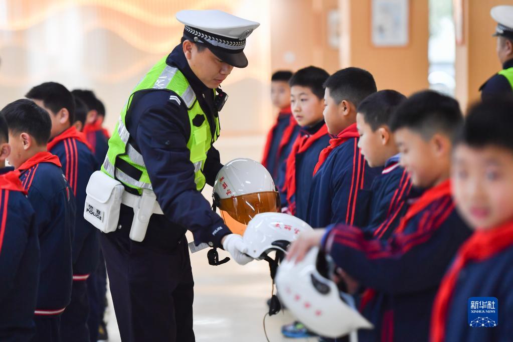 2月6日,在長(cháng)沙市望城區長(cháng)郡月亮島學(xué)校,交警為學(xué)生們發(fā)放頭盔。