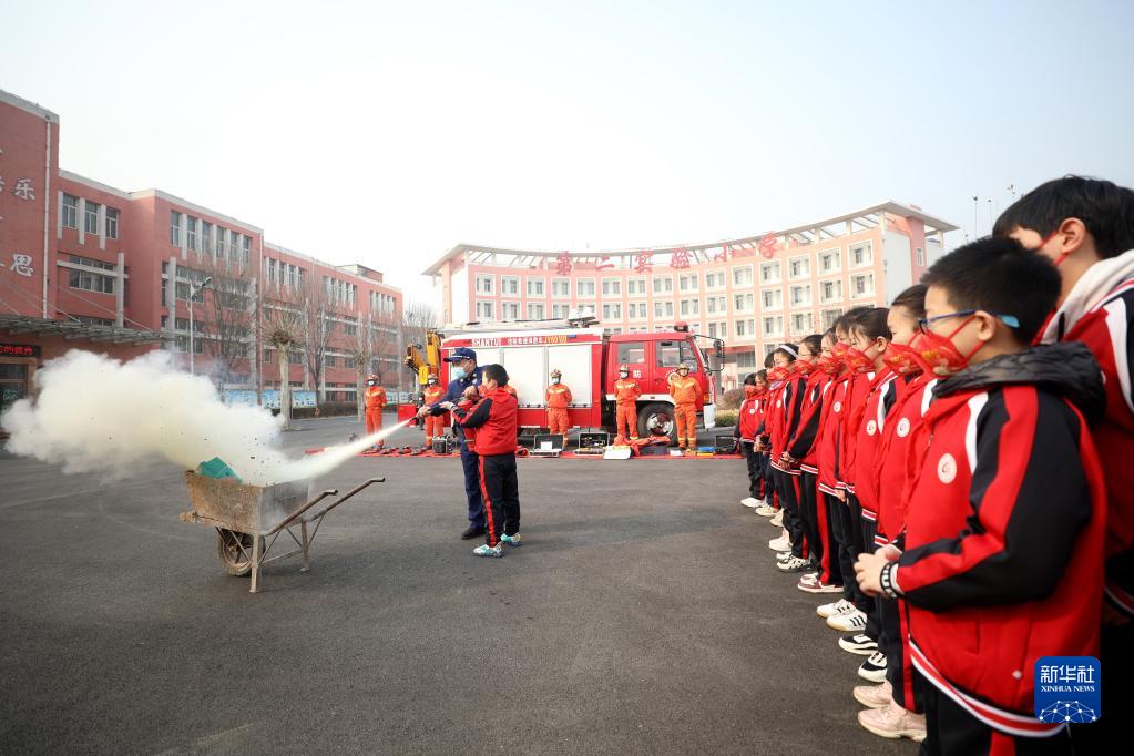 2月6日,在隆堯縣第二實(shí)驗小學(xué),學(xué)生在消防員指導下學(xué)習使用干粉滅火器滅火。