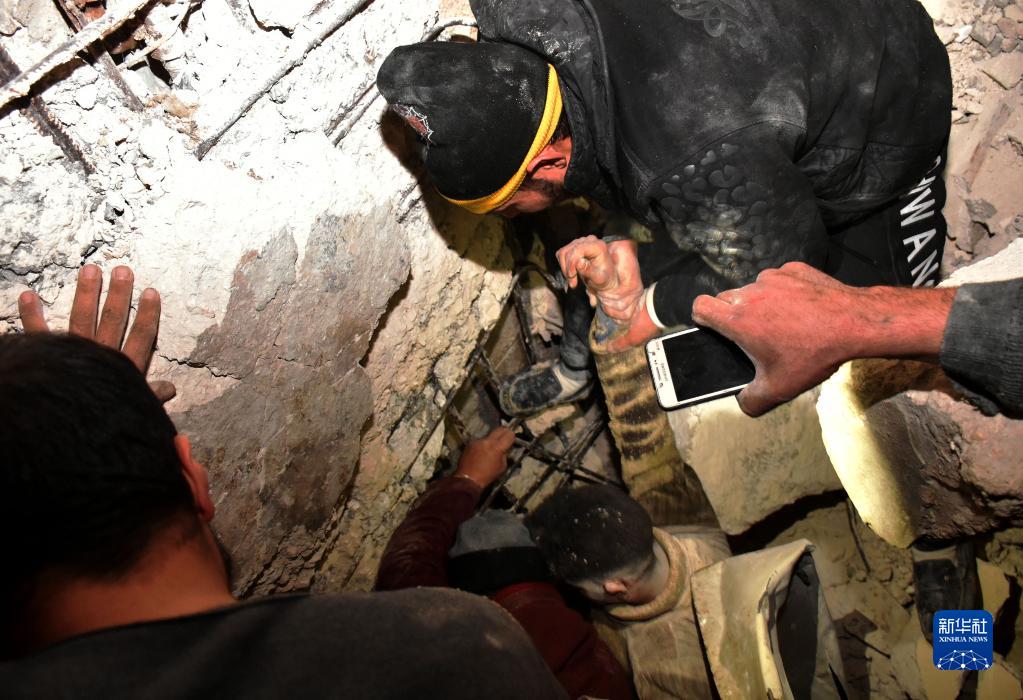 2月6日,人們在敘利亞哈馬省一處倒塌的建筑上進(jìn)行救援。