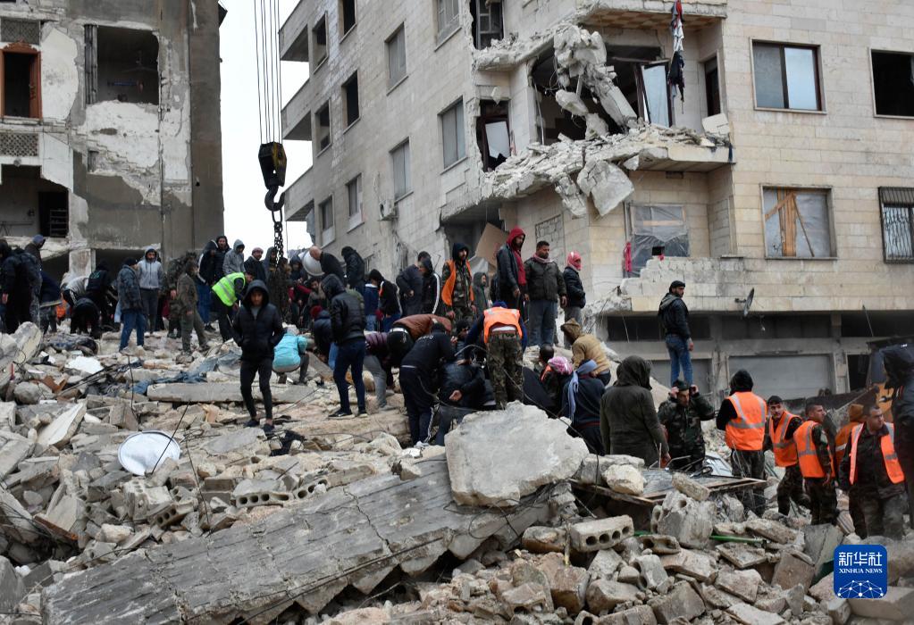 2月6日,人們在敘利亞哈馬省一處倒塌的建筑上進(jìn)行救援。
