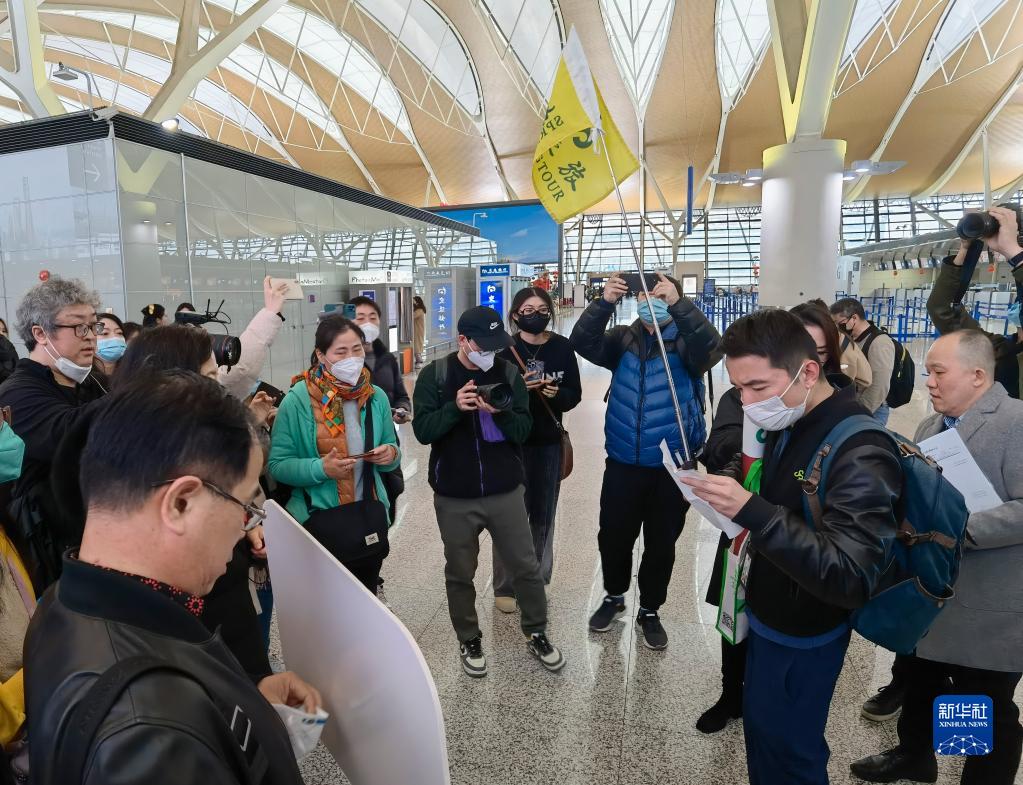 2月6日,在上海浦東國際機場(chǎng),出境團隊游領(lǐng)隊師文(舉旗者)向游客說(shuō)明相關(guān)注意事項。