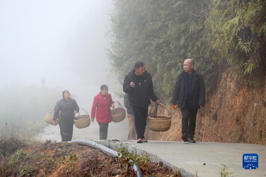 在福斗村大森林碩豐農業(yè)高山水果基地,返鄉創(chuàng )業(yè)種植高山水果的村民陳繩春(右一)帶領(lǐng)工人采收沃柑(2月5日攝)。