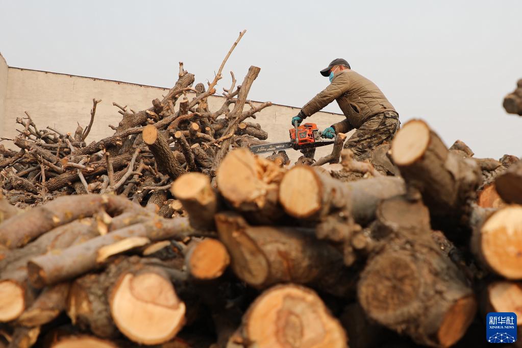 2月6日,在石家莊市趙縣范莊鎮秀才營(yíng)村一家再生資源回收公司,工作人員在切割回收的梨樹(shù)枝。