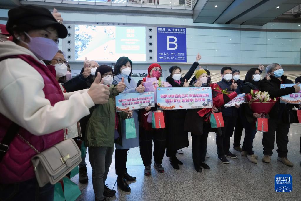 2月6日,內地與港澳人員往來(lái)全面恢復后,香港赴北京首個(gè)旅游團的游客在首都國際機場(chǎng)合影留念。