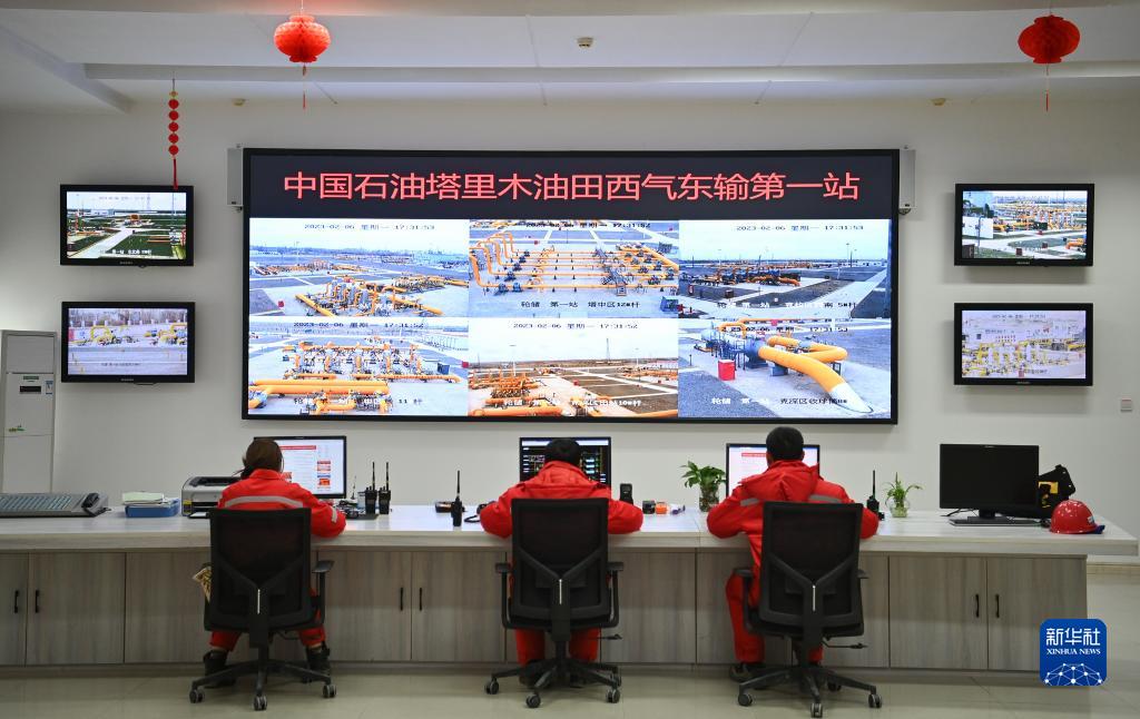2月6日,工作人員在塔里木油田西氣東輸第一站站控室內監控管線(xiàn)運行參數。