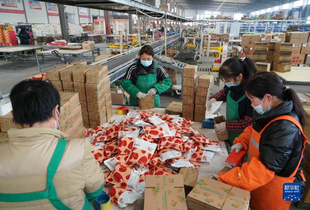 2月6日,在位于武功縣的陜西美農網(wǎng)絡(luò )科技有限公司物流倉,工作人員在打包食品快遞包裹。