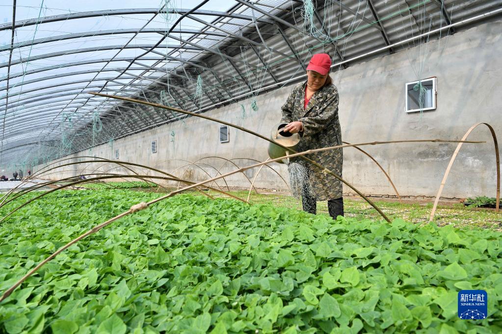 2月7日,在湖北省襄陽(yáng)市??悼h寺坪鎮庹家坪村蔬菜種植基地育苗大棚,村民為蔬菜秧苗噴水。