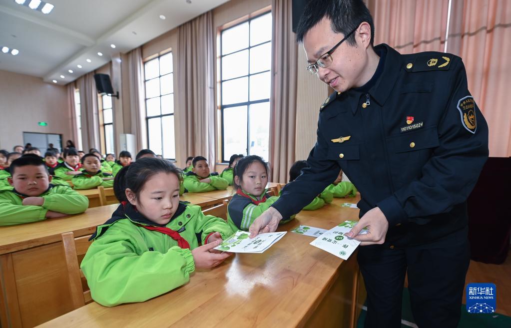 2月7日,杭州市生態(tài)環(huán)境局臨安分局的黨員志愿者在潛川小學(xué)向學(xué)生發(fā)放“無(wú)廢校園”宣傳單。