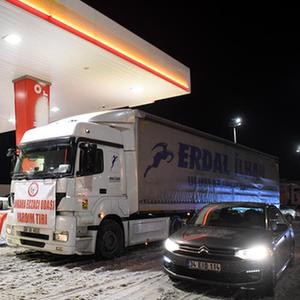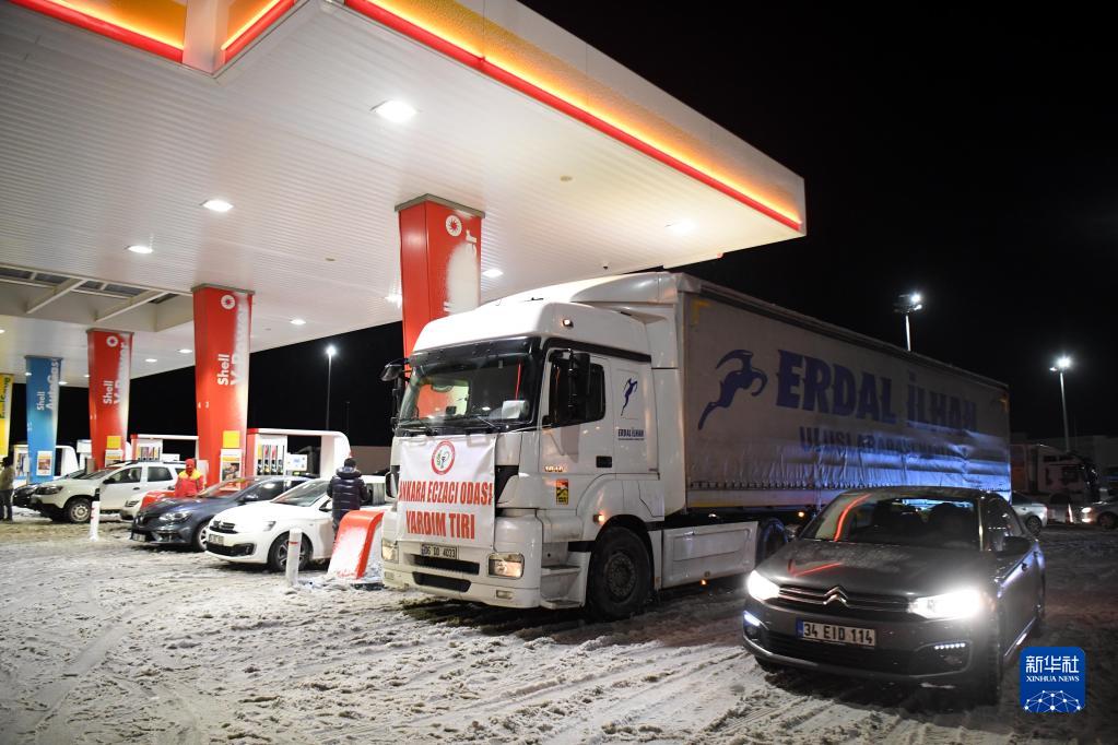 這是2月7日在土耳其伊斯坦布爾至安卡拉公路一加油站拍攝的運送救援物資的車(chē)輛。