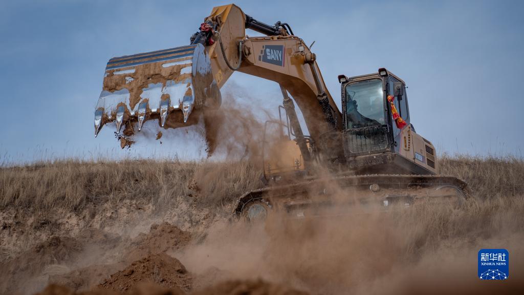 2月7日,工人操作挖掘機在寧夏固原市西吉縣硝河鄉蘇溝村平整土地。