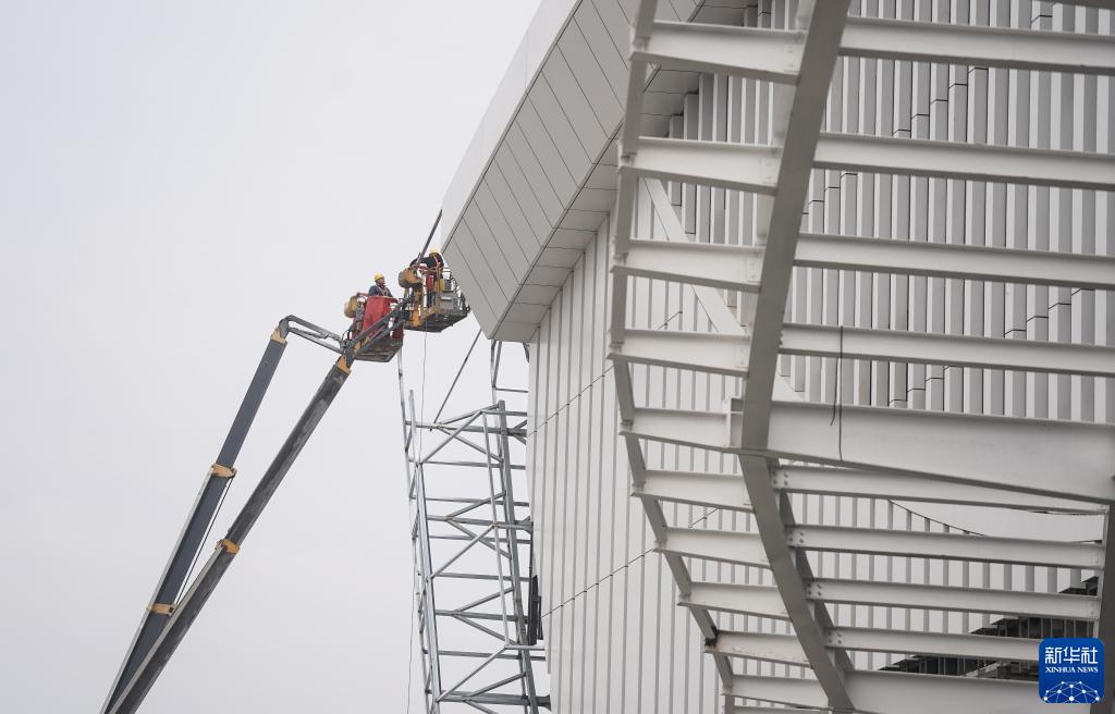 2月7日,工人在江蘇南沿江鐵路江陰站站房作業(yè)。