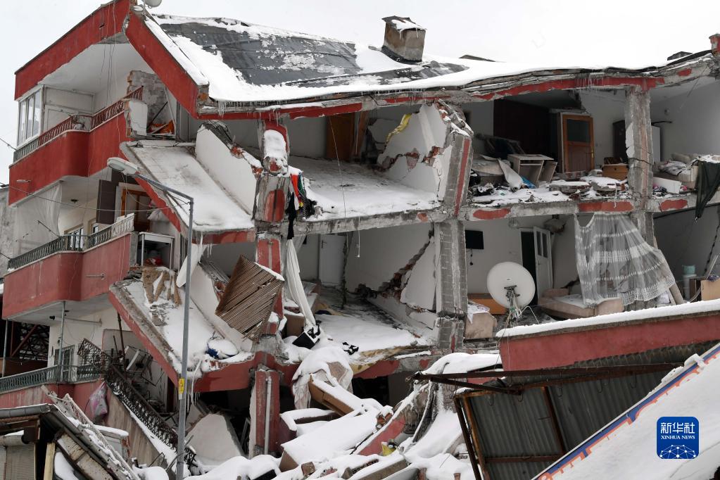 這是2月7日在土耳其卡赫拉曼馬拉什省的埃爾比斯坦地區拍攝的地震中受損的建筑物。