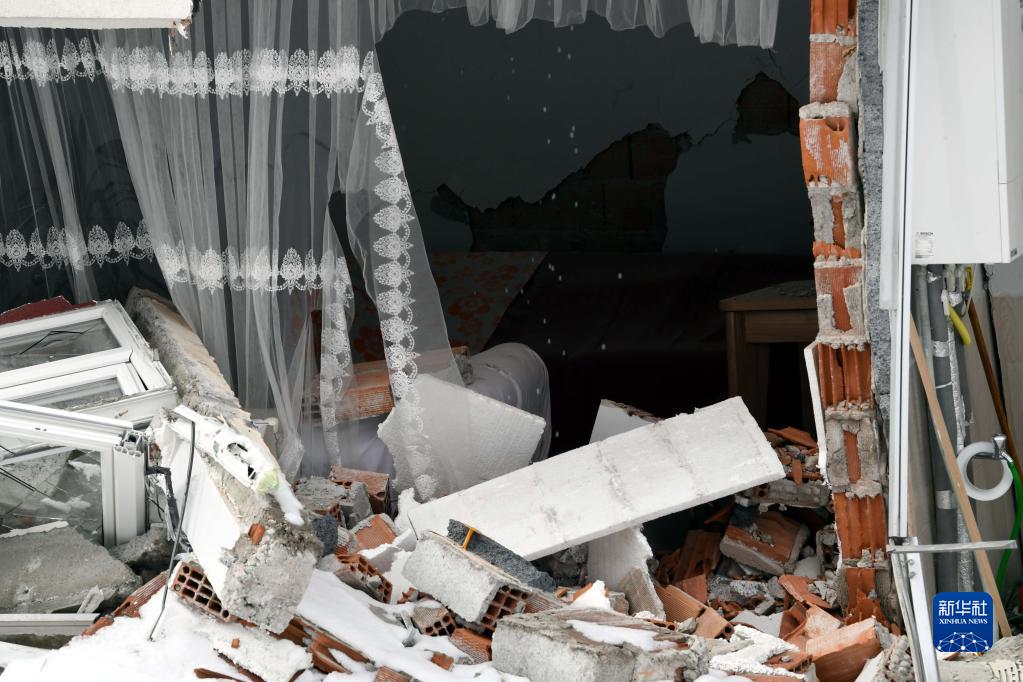 這是2月7日在土耳其卡赫拉曼馬拉什省的埃爾比斯坦地區拍攝的地震中受損的建筑物。