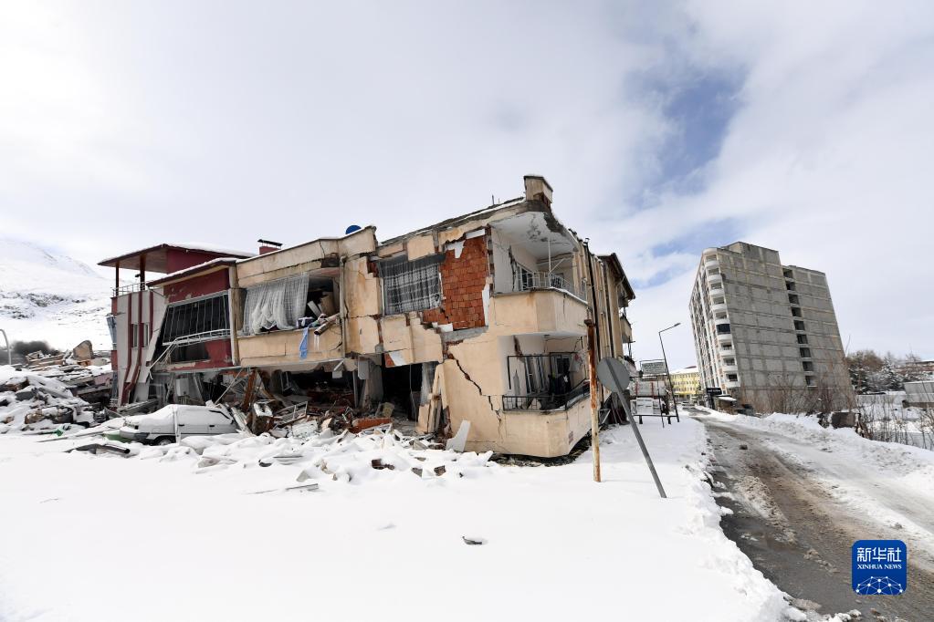這是2月7日在土耳其卡赫拉曼馬拉什省的埃爾比斯坦地區拍攝的地震中受損的建筑物。