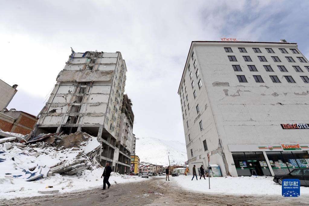 2月7日,在土耳其卡赫拉曼馬拉什省的埃爾比斯坦地區,人們經(jīng)過(guò)地震中受損的建筑物。