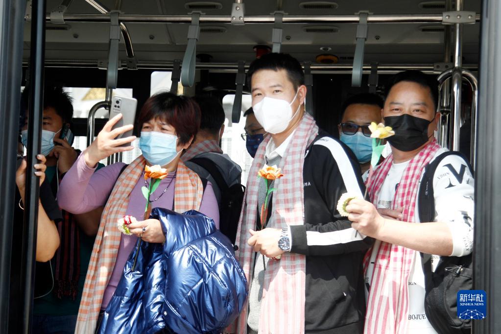 2月7日,中國旅客在柬埔寨首都金邊國際機場(chǎng)乘坐機場(chǎng)巴士。