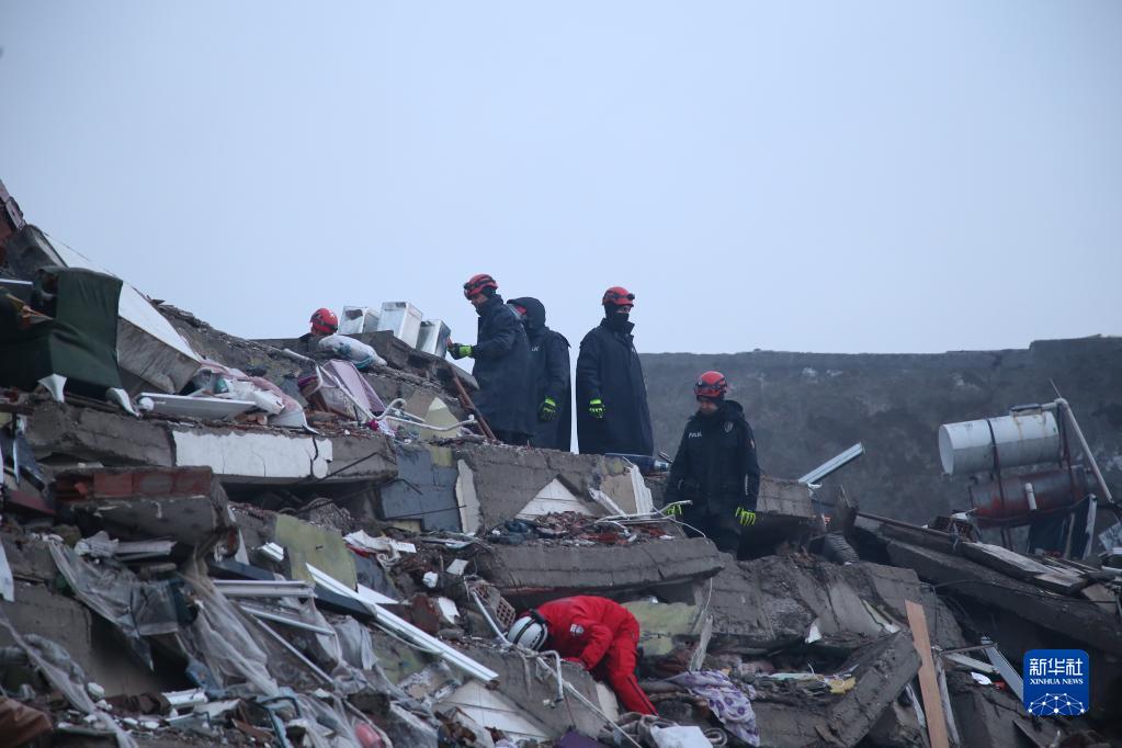 2月7日,在土耳其南部卡赫拉曼馬拉什市市中心,救援人員在搜救??ê绽R拉什市是本次地震重災區卡赫拉曼馬拉什省省會(huì ),是遭受地震破壞最為嚴重的城市之一。