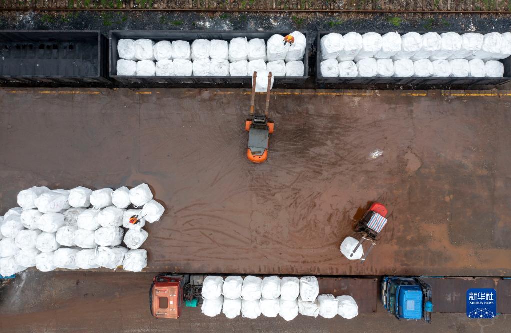 2月7日,江西省宜春西火車(chē)站的工作人員在裝卸化肥(無(wú)人機照片)。