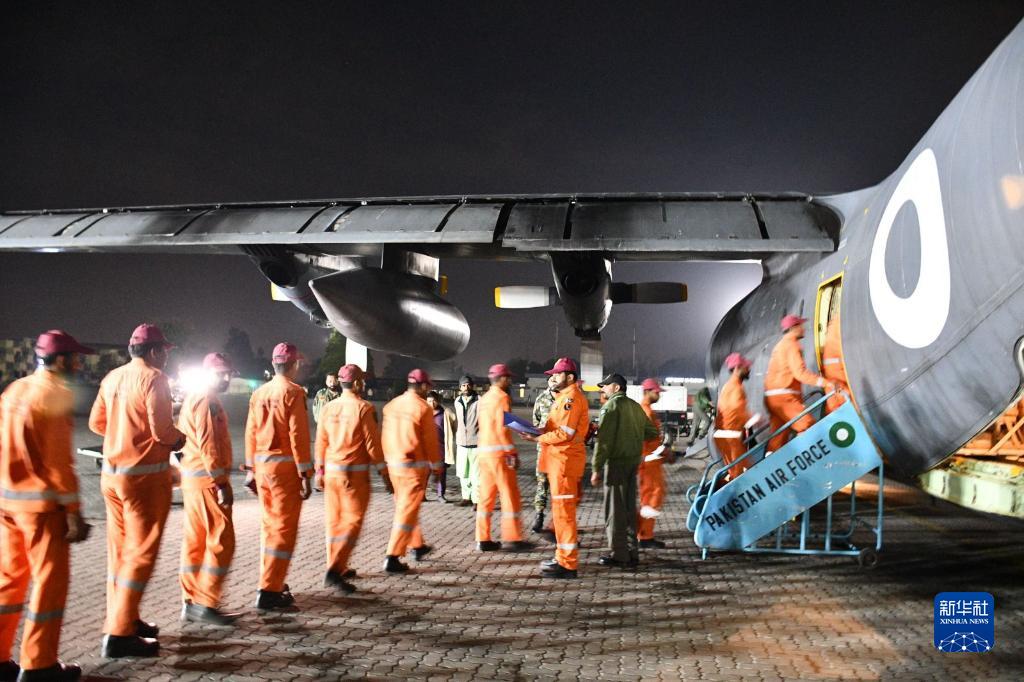 2月7日,在巴基斯坦拉瓦爾品第的努爾汗空軍基地,救援隊隊員登機準備飛赴土耳其。