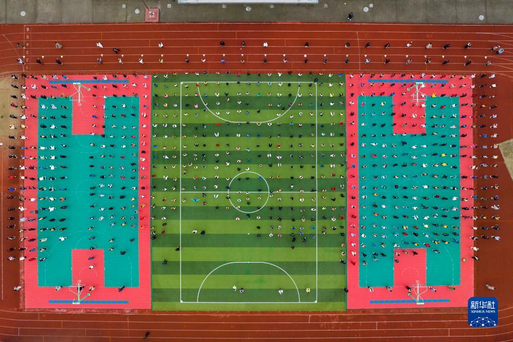 2月8日,浙江省余姚市黃家埠鎮中心小學(xué)的學(xué)生們在做體操(無(wú)人機照片)。