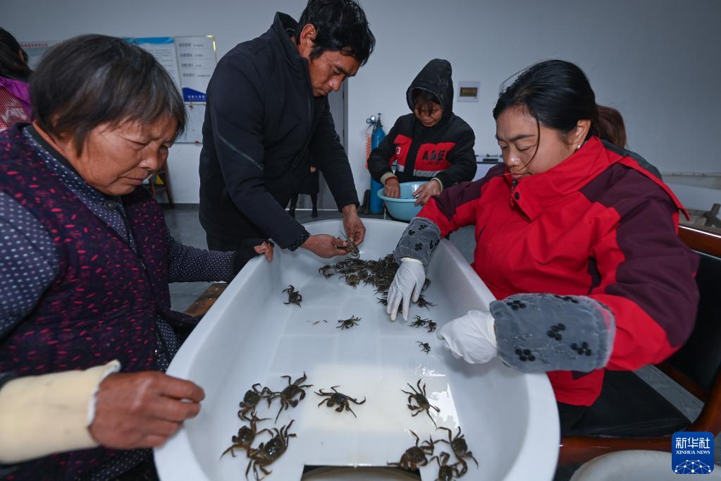 2月8日,在位于湖州市織里鎮的湖州湖星生態(tài)農業(yè)有限公司的車(chē)間內,工作人員和養殖戶(hù)在篩選太湖蟹苗。