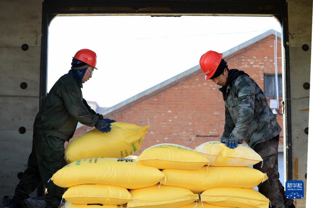 2月6日,在鐵嶺縣新臺子站,工人在搬運化肥生產(chǎn)原料。