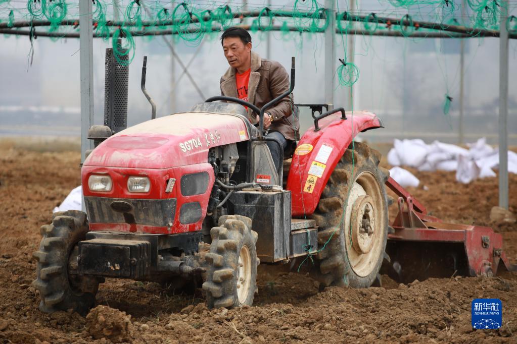 2月8日,貴州省龍里縣灣灘河鎮園區村村民駕駛農機在大棚里翻耕土地。